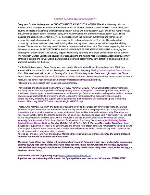 I recall, while Marnelle lived with and battled her cancer bravely and courageously for over six years, she always walked to support the work of the American Cancer Society in their efforts and programs to find cures. treatments. preventions, and to provide services for cancer victims and their families. As mentioned previously, Marnelle's last walk was in October 2005, two months before she left us on Dec. 15. Marnelle never said, "I can't walk." No, she got up and moved forward. MARNELLE ALWAYS WALKED! If she did, so can I, and so can my family and friends, especially from Assumption School and Parish in San Leandro. That's why l've joined the 2025 Making Strides Against Breast Cancer Walk on Sunday, October 19, at Thrive City, 1 Warriors Way, In San Francisco. I and thousands of supporters will walk to honor survivors and thrivers from breast cancer, to remember those we ve lost, to offer support to anyone in our community who's been affected by cancer, and to hasten the day when breast cancer and all cancers will no longer be killing diseases