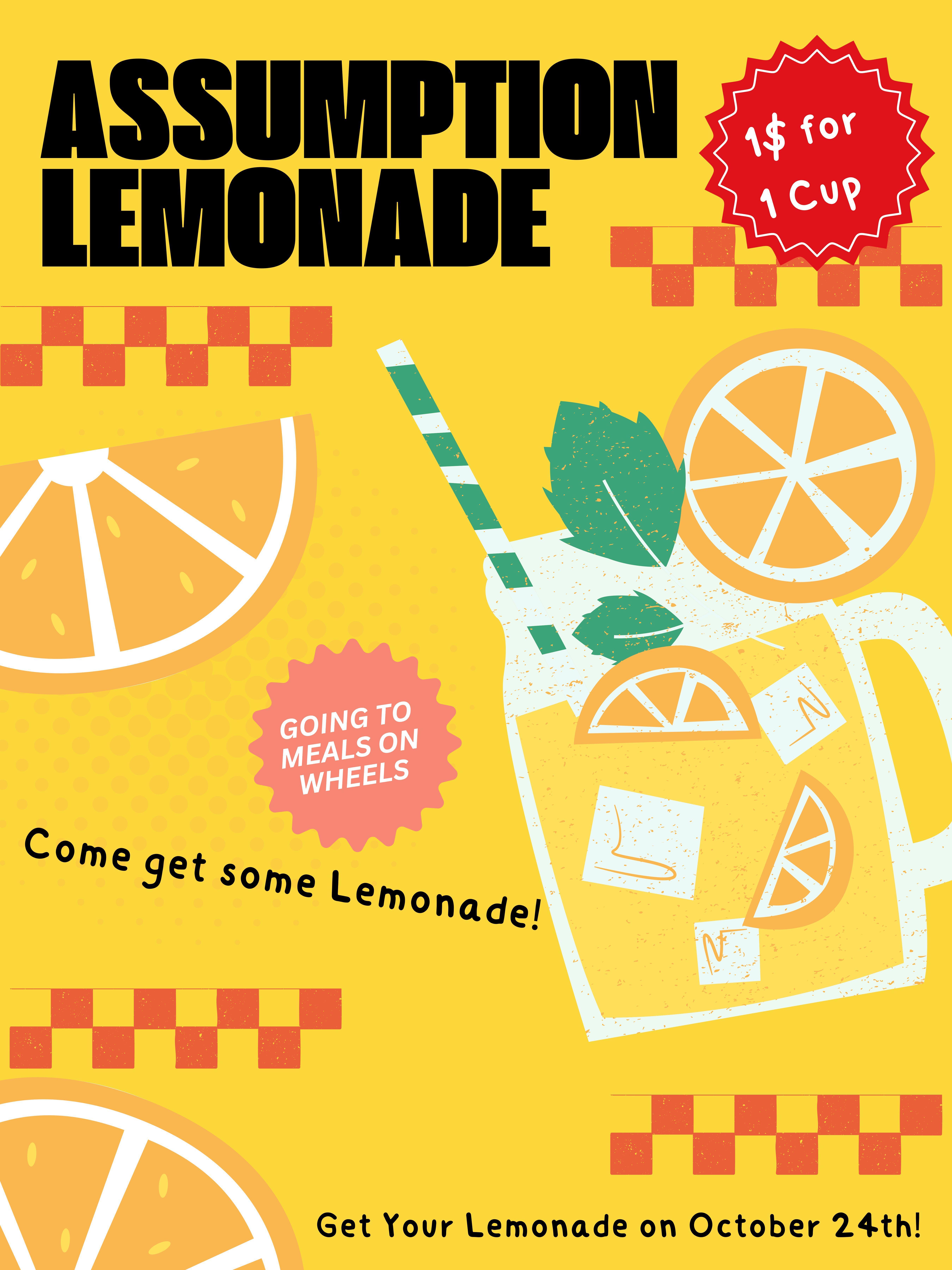 Come get some refreshing lemonade at Campus Ministry's fundraiser on October 24th! For just $1 a cup, you can enjoy a delicious drink and support a great cause. All proceeds from the lemonade stand will go to Meals on Wheels. We hope to see you there!