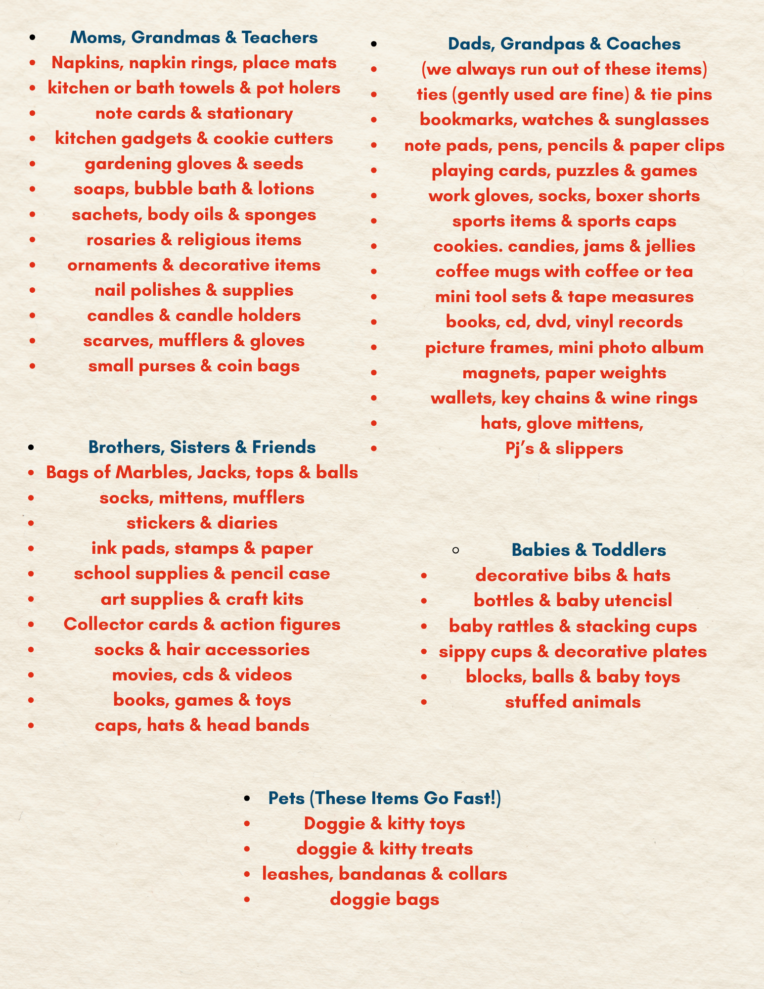 It's almost that time of year. Start to gather your new and gently used items to donate. We are looking for Elf Helpers to sort the donations, set-up and work the day of. Please read: