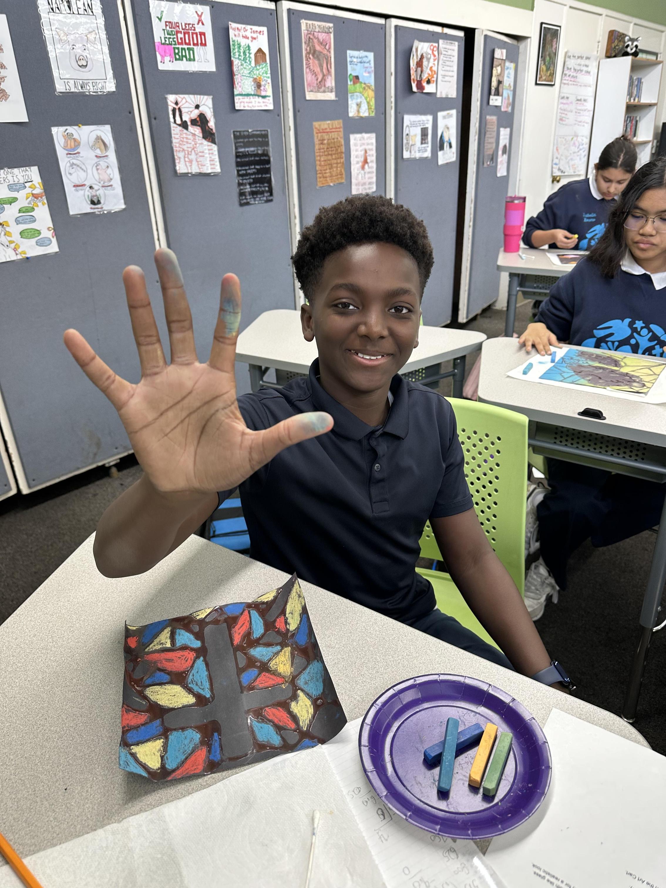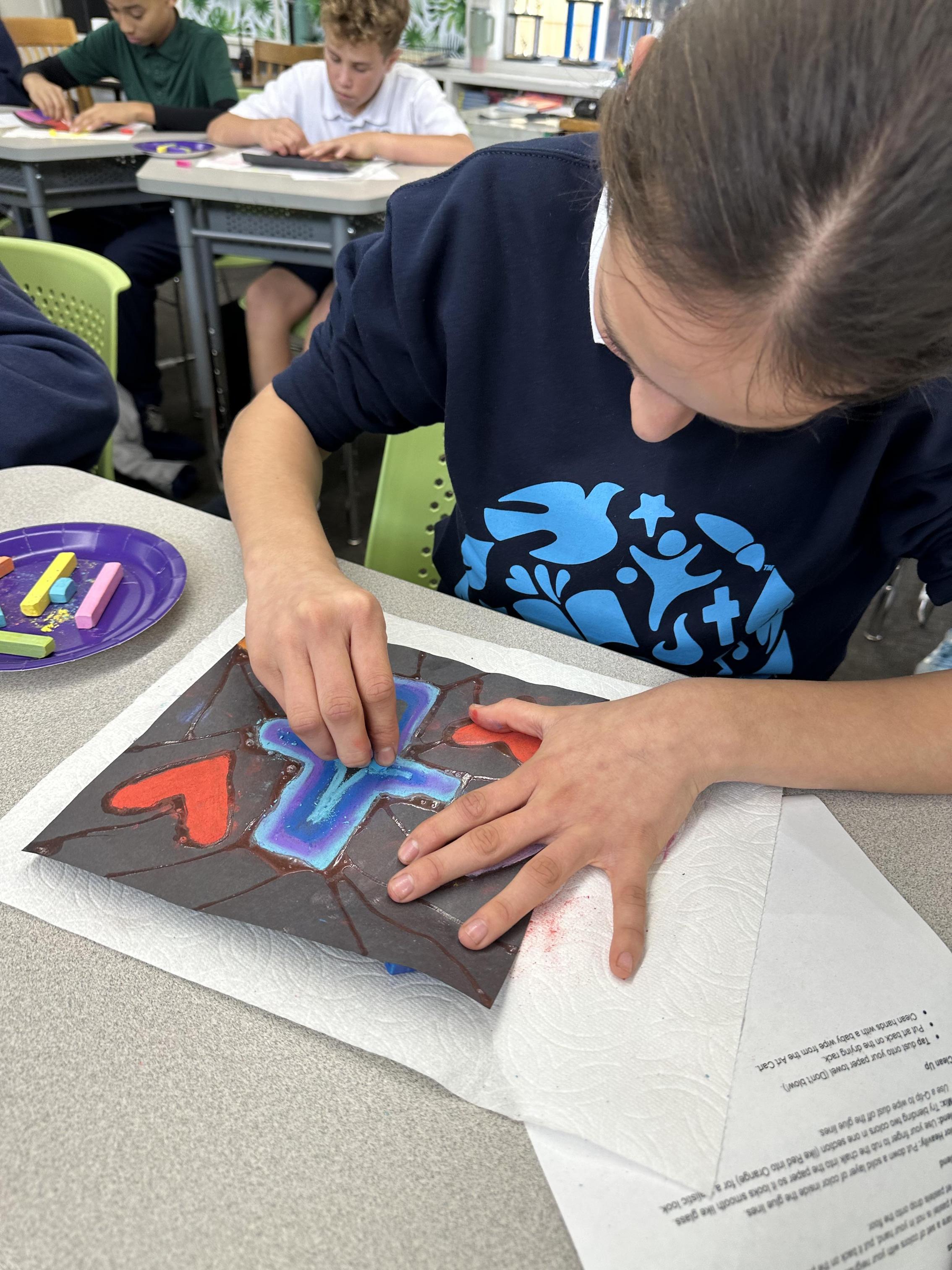 The process required patience and precision. Students first drew their designs in pencil and traced them with liquid glue to create the raised "leading" found in traditional windows. In the second stage, they used chalk pastels to fill the panes with color. By blending the chalk against the black background, the students achieved a glowing, luminous effect. These beautiful pieces serve as a visual reminder to look for the light and color in our everyday lives.