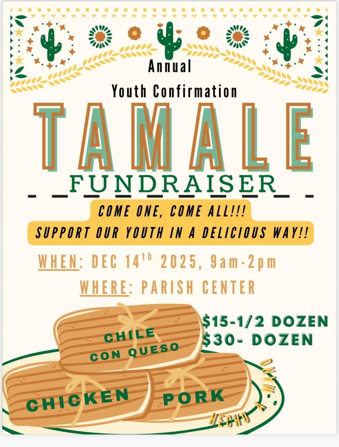 Support our Confirmation students while enjoying fresh, homemade tamales! This year, there will be no pre-sales — just come by on Sunday, December 14 at the Parish Center.