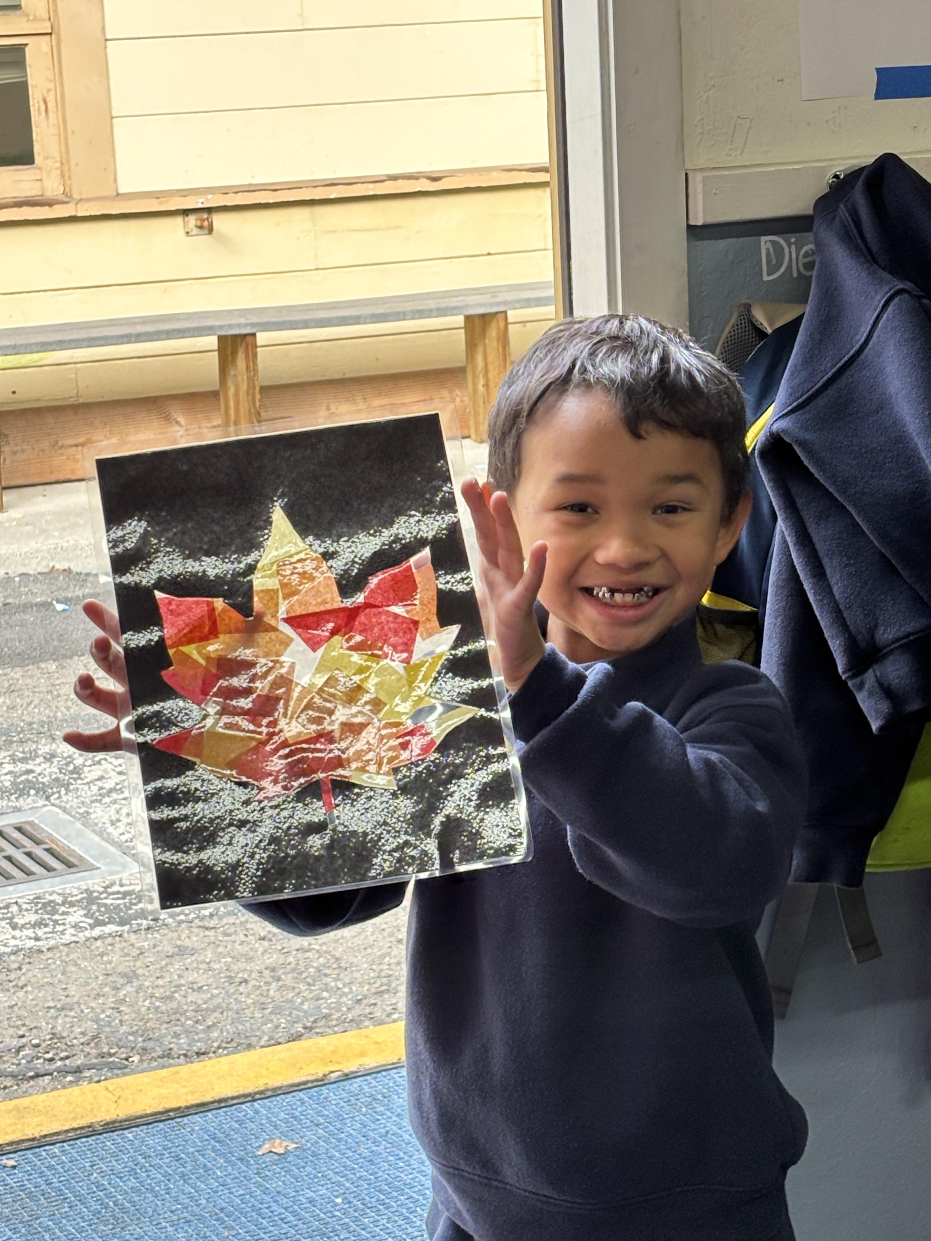 The Kindergarten students were learning about types of leaves, the chlorophyll that gives them color, and how leaves change and fall in autumn. Students made fall leaves to hang at home as a decoration for Thanksgiving.