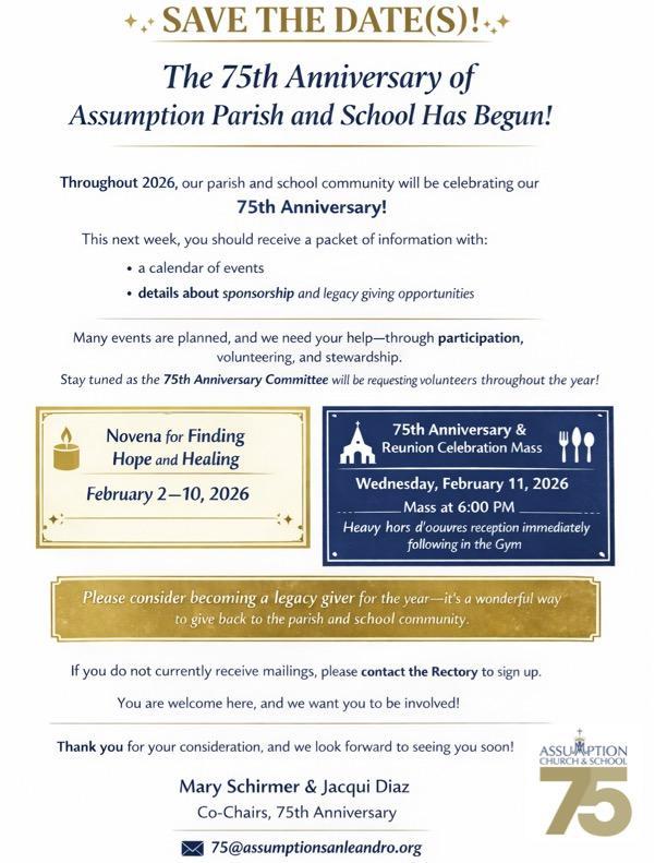 In 2026, Assumption Church and School proudly celebrate our 75th Anniversary: a joyful milestone honoring our faith-filled past and looking ahead with hope. Throughout the year, we will gather as one community for special events, celebrations, and opportunities to reconnect with friends, alumni, and families old and new.