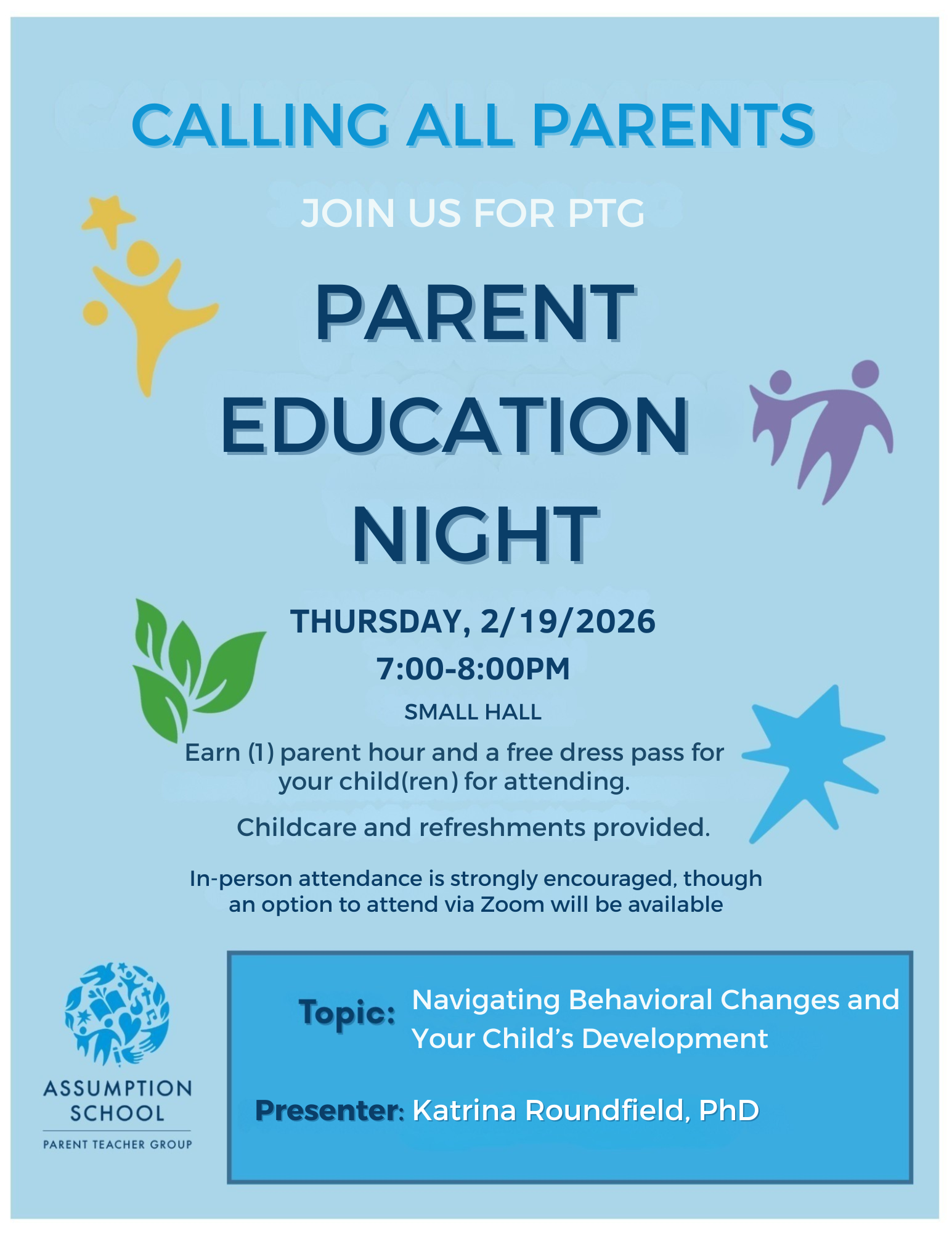 Parents will have the opportunity to engage in a presentation from Katrina Roundfield, PhD, licensed child psychologist, former professor at UCSF, CEO/Founder of Tara (www.withtara.com) and current parent of our Assumption community! Mrs. Roundfield will discuss and provide parenting tools and strategies to navigate our child's behaviors and developmental changes over time. The presentation will start at 7:00 pm in the Small Hall; however, you are encouraged to arrive a bit early (6:50 pm) to socialize with other parents and enjoy refreshments. Childcare will be provided, and your attendance will earn you (1) parent hour and a free dress pass for your child to be used at a later date. While we strongly encourage you to come in-person, we will also offer a Zoom option and the link will be provided on the day of the event via email.