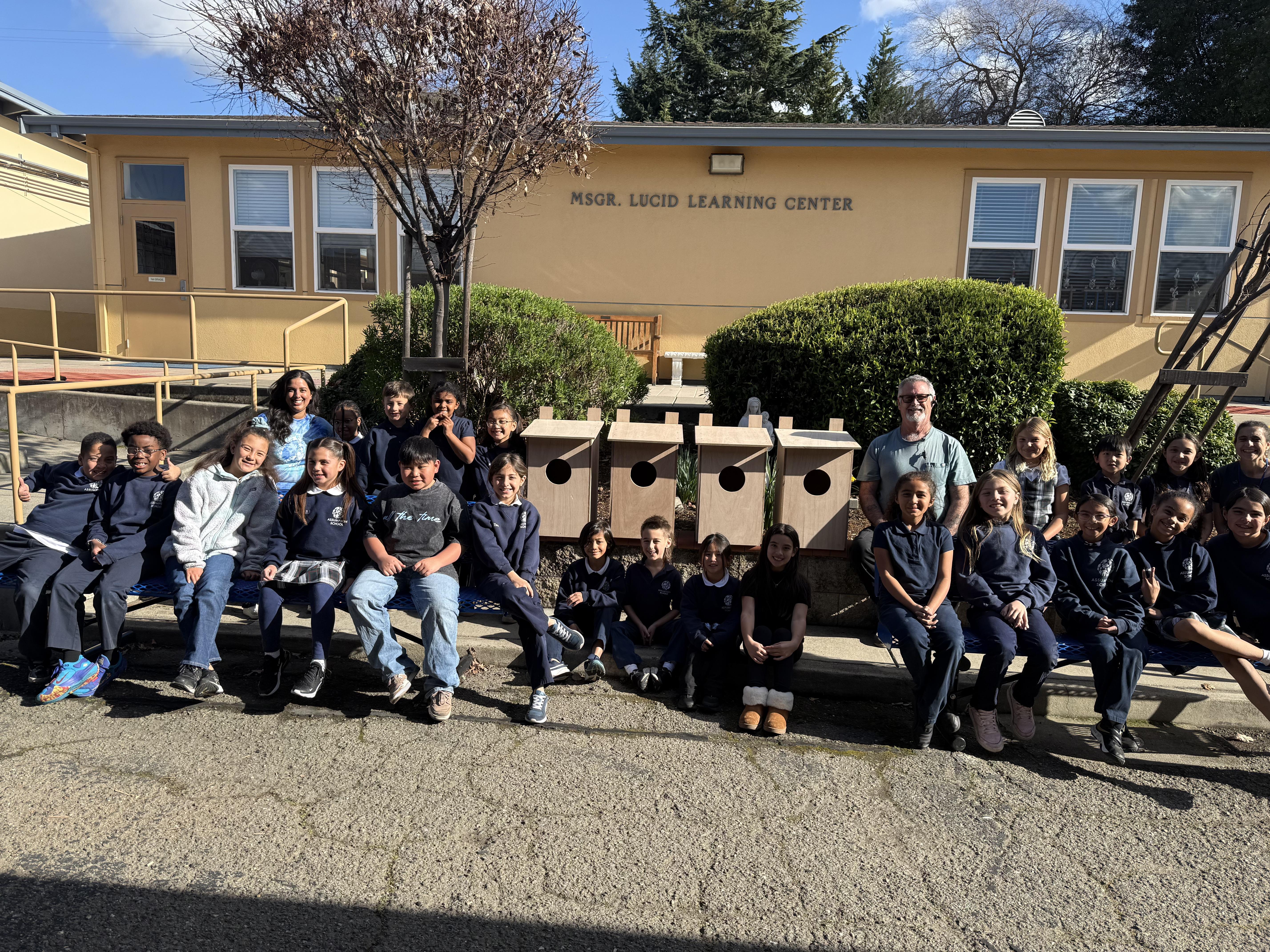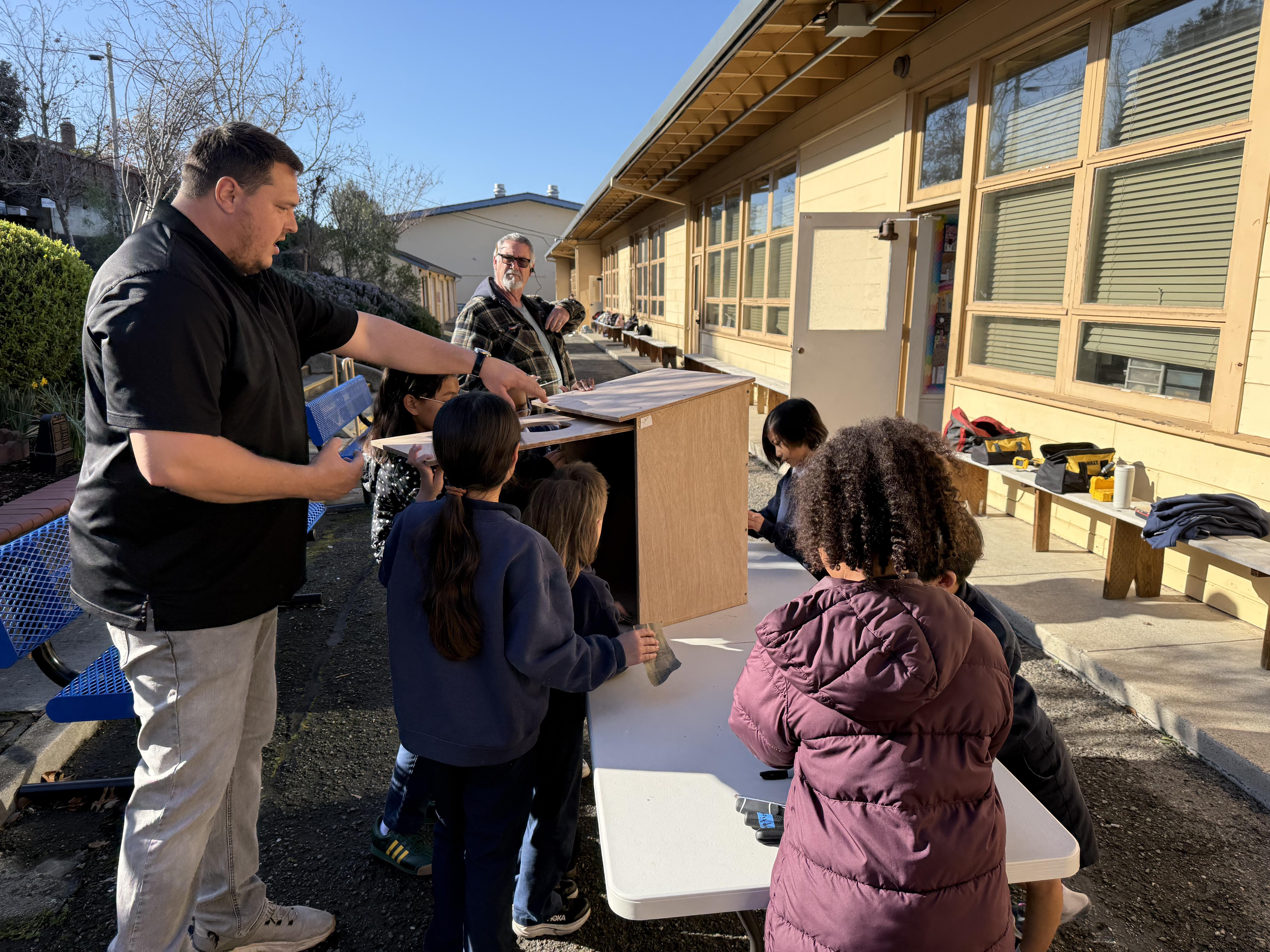 Together, we had enough for the class to also build four barn owl nest boxes to donate to the City of San Leandro to post in local parks for natural rodent control! Dirk (Ryan's grandpa) cut all of the wood, while Mr. Clement and Svetlin (Sofia's dad) helped the students assemble the boxes.