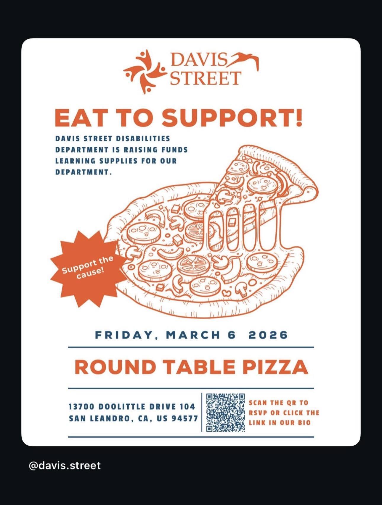 Help the Davis Street Disabilities Department raise funds for essential learning supplies! Join us for a delicious meal at Round Table Pizza and a portion of the proceeds will go directly to supporting the department.