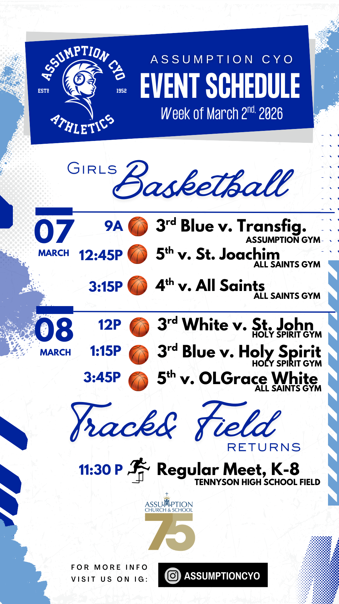 This Weekend's CYO Events - March 7th & 8th Don't forget to follow us on Instagram @AssumptionCYO for real-time updates and team highlights!