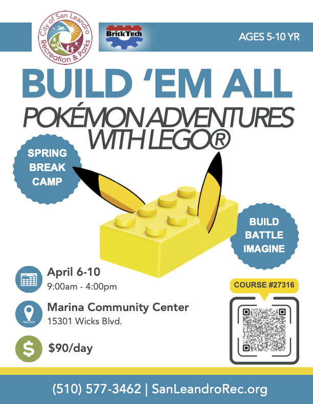 Parents can register their children for Course #27316. To sign up, scan the QR code found on the event flyers, visit SanLeandroRec.org, or call (510) 577-3462. Whether your child is a LEGO® master or a Pokémon fanatic, this camp offers a creative and engaging way to spend the school break!