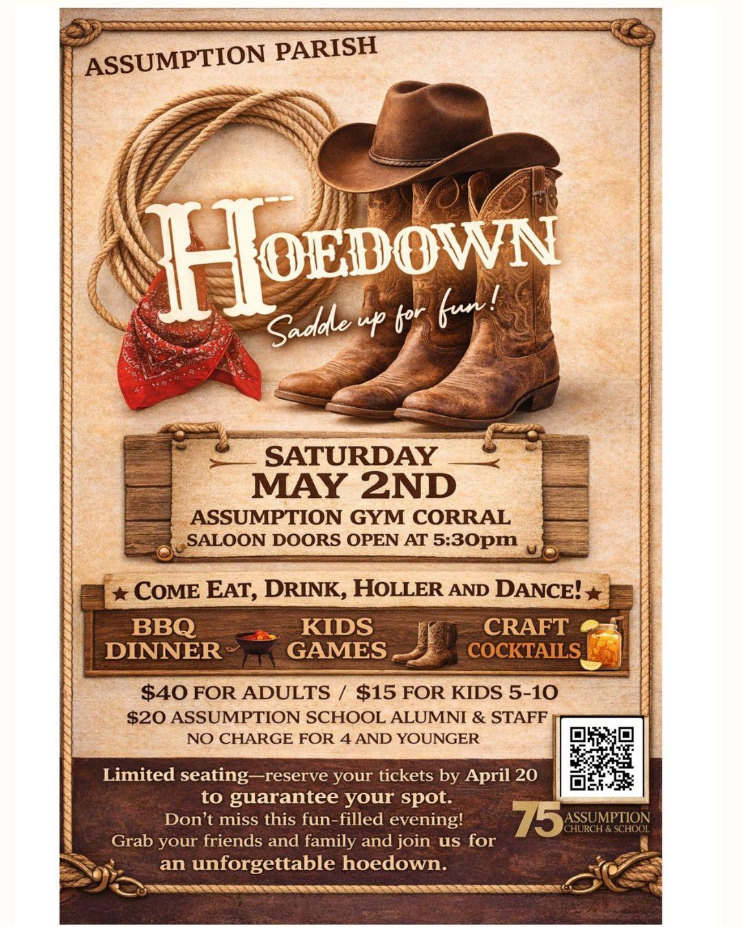 Get ready to kick up your heels! We are excited to invite you to the Assumption Gym Corral on Saturday, May 2nd, for our community Hoedown. Saloon doors open at 5:30 PM for an evening packed with food, friends, and country fun.