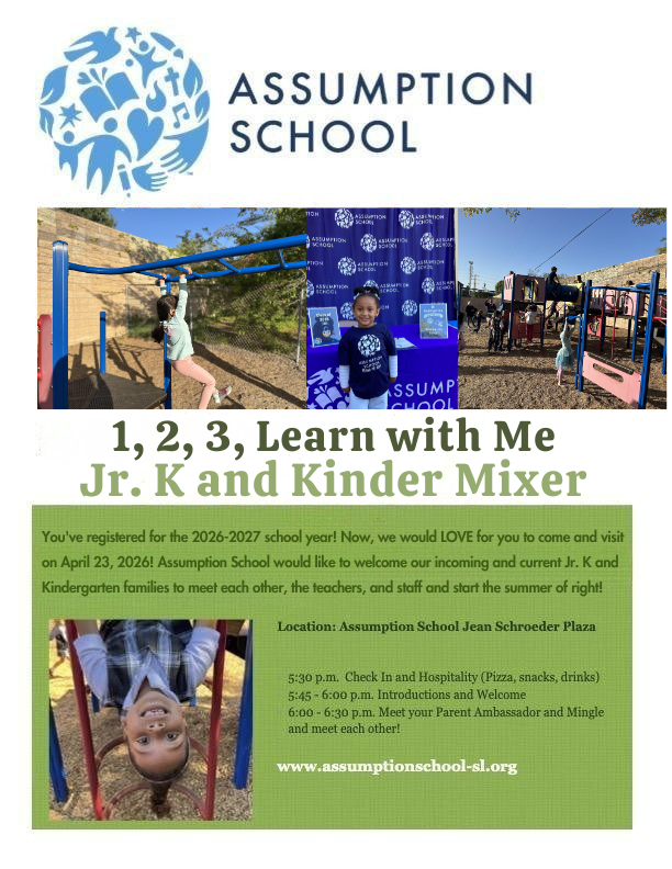 You’ve registered for the 2026-2027 school year! Now, we would LOVE for you to come and visit! Assumption School would like to welcome our incoming and current Jr. K and Kindergarten families to meet each other, the teachers, and staff and start the summer off right! Pizza, snacks, and water will be provided.