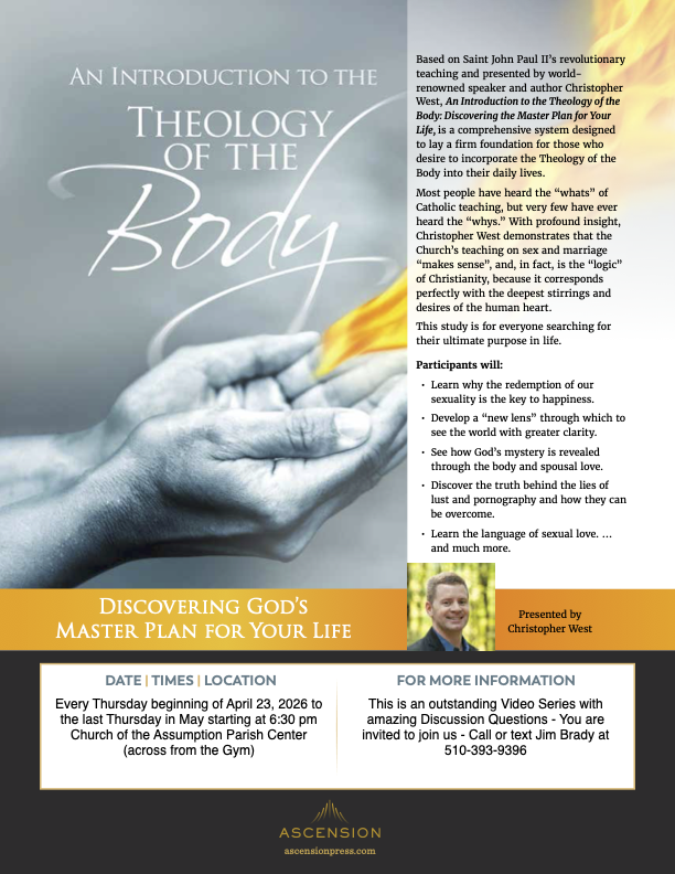 We are pleased to invite you to a new Faith Formation series beginning next week: An Introduction to the Theology of the Body: Discovering the Master Plan for Your Life. Based on Saint John Paul II’s revolutionary teaching and presented by world-renowned speaker Christopher West, this video series and discussion group explores the "whys" behind Catholic teaching and the deepest desires of the human heart. Participants will develop a "new lens" through which to see the world and discover their ultimate purpose.